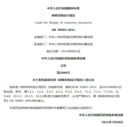 本規范是根據原建設部《關于印發〈2007年工程建設標準規范制訂、修訂計劃(第一批)〉的通知》(建標[2007]125號)的要求,由中國建筑東北設計研究院有限公司會同有關單位在《砌體結構設計規范》GB 50003-2001的基礎上進行修訂而成的。