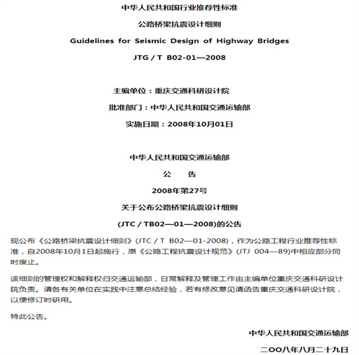 根據交通部《關于下達1999年度建設標準、規范、定額等編制、修訂工作計劃的通知》(交通部公路發[1999]82號),由重慶交通科研設計院組織對《公路工程抗震設計規范》 (JTJ 00489)橋梁抗震設計部分進行修訂,編寫《公路橋梁抗震設計細則》。