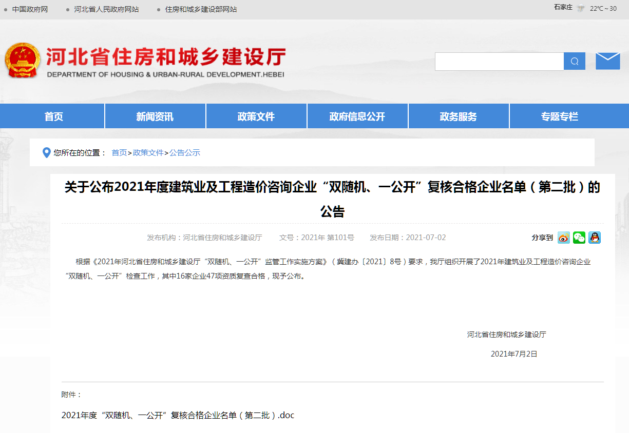 關(guān)于公布2021年度建筑業(yè)及工程造價咨詢企業(yè)“雙隨機、一公開”復(fù)核合格企業(yè)名單(第二批)的公告