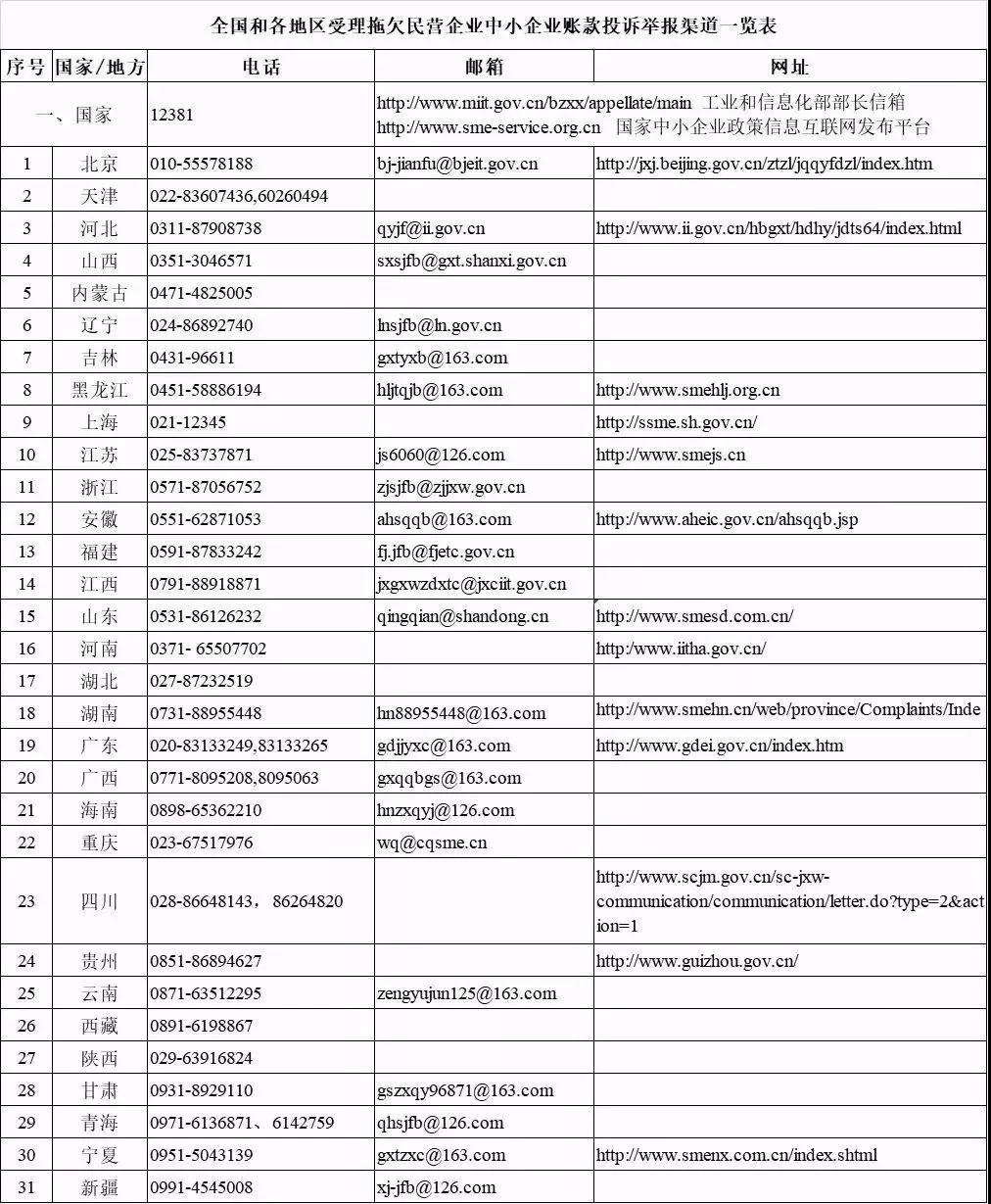 拖欠民營企業、中小企業賬款的投訴舉報渠道見下表。可通過電話、郵箱舉報,或打開相應網站進行在線投訴。