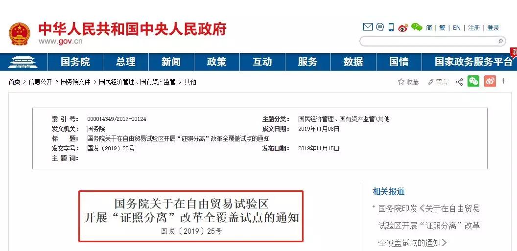 文件名稱:國務院關于在自由貿易試驗區開展“證照分離”改全覆蓋試點的通知(國發〔2019〕25號);
